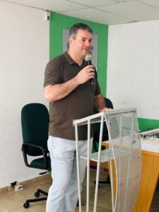 A reunião começou às 9h, com um welcome coffee de recepção, seguido da palestra do especialista Alexandre Soares, que abordou o tema “NR 1 – Como Cuidar da Saúde Mental da sua Equipe e Aumentar a Produtividade”.