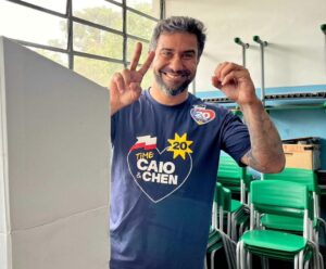 O candidato à reeleição para o comando da Prefeitura de Mogi das Cruzes, Caio Cunha (Podemos) votou na manhã deste domingo (6/10) ao lado da filha Júlia, na Escola Estadual Aprígio de Oliveira, localizada no Centro de Mogi das Cruzes. O tenente coronel Joel Chen, do mesmo partido, candidato a vice-prefeito, também votou no mesmo local e chegou junto com o prefeito.