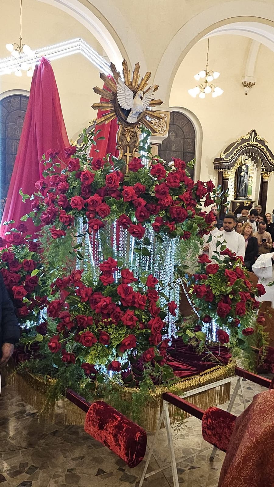A estrutura do andor impressiona por sua riqueza de detalhes. Confeccionado em veludo vermelho, com acabamento em alta costura, franja dourada e galão, é adornado com rosas colombianas, aspargo, avenca e galhos de camélia, compondo uma estética viva e elegante. As luzes de LED emolduram a imagem do Divino, que reluz sob pingentes de cristal e brilho de pedrarias finas — um verdadeiro altar em movimento.