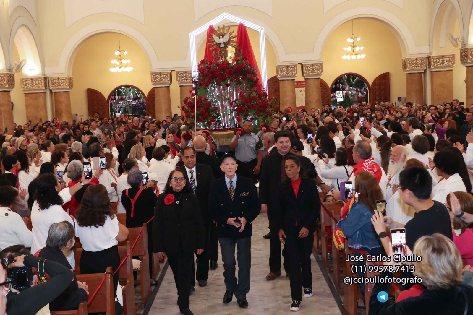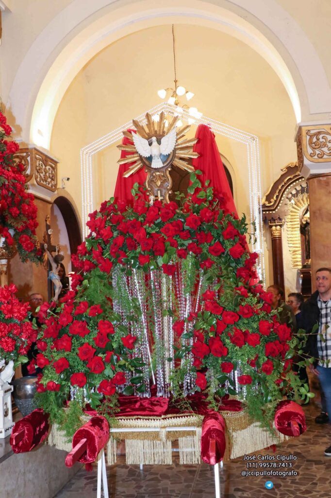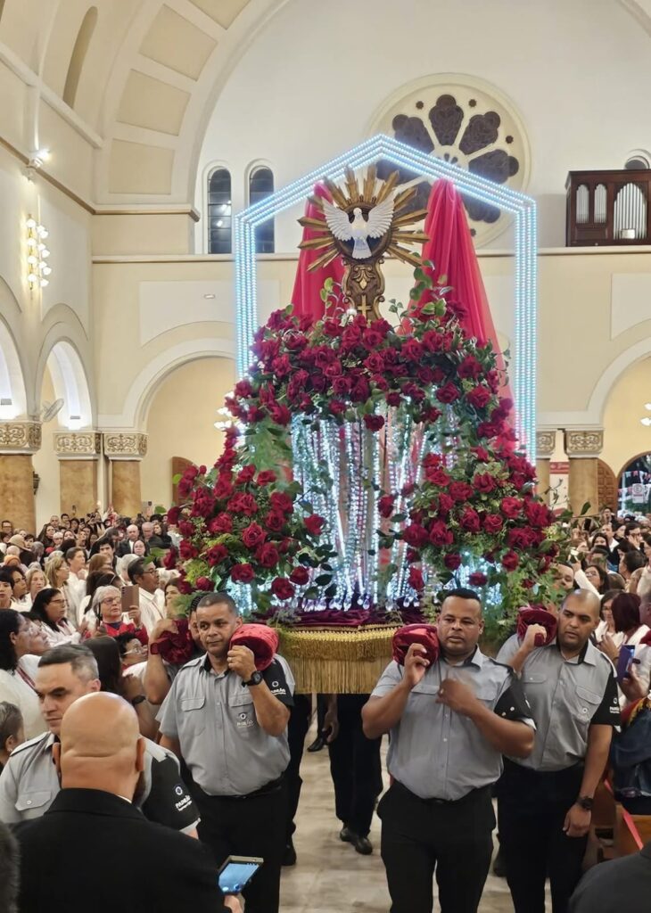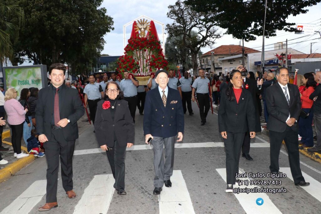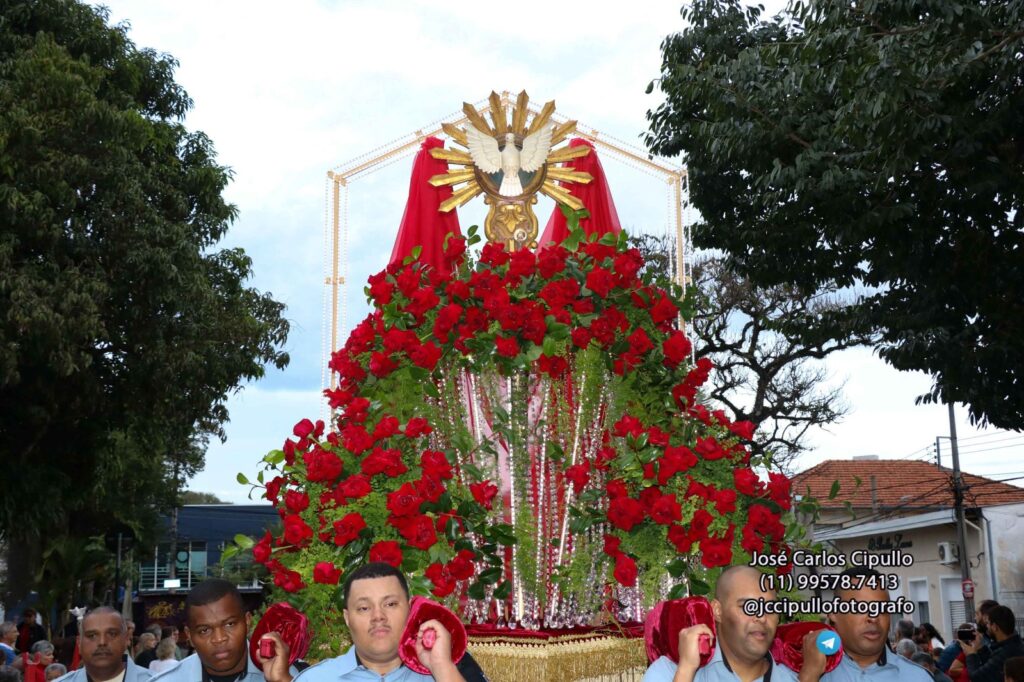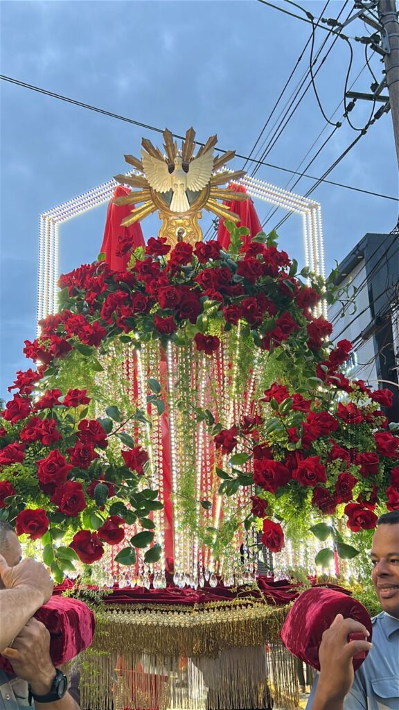 Entre rosas colombianas vermelhas, cristais Swarovski e folhas de camélia, um símbolo de fé e tradição ganhou vida mais uma vez em Mogi das Cruzes, na tarde deste domingo (8), na Procissão de Pentecostes, o que marcou o encerramento da Festa do Divino Espírito Santo de Mogi das Cruzes. O Andor do Divino, que brilha nas ruas durante o cortejo, não só carrega a imagem sagrada que inspira a Festa do Divino, mas também quatro décadas de dedicação artística e amor à espiritualidade.