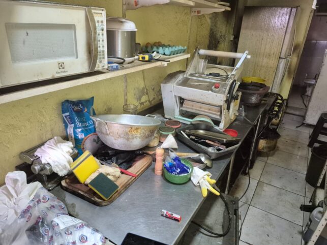 No local, foi observado que havia crostas de gordura em todos os equipamentos, assim como nas mobílias, utensílios, paredes e piso. Ainda foram identificados acúmulo de lixo, que estava espalhado sobre o piso, e falta de divisória adequada entre o banheiro, que tinha resíduos no vaso sanitário, e a dependência onde eram preparados os alimentos, provocando forte odor em todo o estabelecimento.