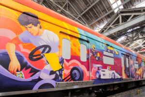 Primeiro vagão apresenta obra ‘O Início de um Campeão’ com os primeiros passos de Senna no esporte. Foto: Governo de SP/Divulgação