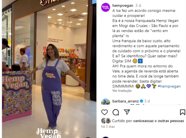 A Hemp Vegan publicou um vídeo apresentando à comunidade a nova franquia em Mogi das Cruzes. ´A Isa fez um acordo consigo mesma: cuidar e prosperar! Ela é a nossa franqueada Hemp Vegan em Mogi das Cruzes – São Paulo e por lá as vendas estão de “vento em planta” rs. Uma franquia de baixo custo, alto rendimento e com aquele pensamento de cuidado com o próximo e o planeta!`, informou a empresa.
