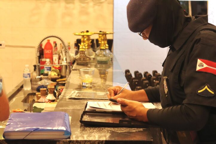 Além disso, a Vigilância Sanitária constatou o descumprimento da Lei Antifumo do Estado de São Paulo (lei estadual nº 13.541/2009). Foi verificado o uso de narguilé no interior do estabelecimento, que exercia atividade de tabacaria, em desacordo com a legislação vigente. Diante da infração, foram lavrados auto de infração e auto de imposição de penalidade, culminando na interdição cautelar do estabelecimento.