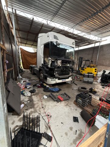 Durante a vistoria, os policiais encontraram um caminhão roubado, modelo Scania R450, que estava sendo desmontado no interior do imóvel. No local, também foram apreendidos diversos equipamentos utilizados na prática criminosa.