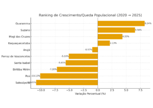 Os números revelam que, apesar do crescimento em cidades mais populosas como Mogi e Suzano, boa parte dos municípios menores enfrenta estagnação ou redução no número de moradores, o que pode refletir questões ligadas a migração, emprego e oferta de serviços públicos .