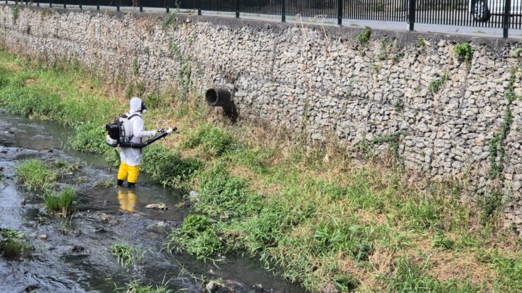 A Divisão de Controle de Zoonoses da Prefeitura de Mogi das Cruzes realizou, nesta quinta-feira (05/06), uma ação estratégica de combate aos escorpiões na região da Escola Municipal Professora Vanda Constantino da Costa, em Braz Cubas. A operação incluiu a aplicação do inseticida microencapsulado DEMAND 2,5 CS nas margens do córrego que fica em frente à unidade escolar.