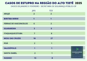 Em toda a Região, 51 estupros foram registrados nas delegacias de polícia no mês de fevereiro. Arujá, Biritiba Mirim e Salesópolis mantiveram os mesmos números de casos registrados no bimestre, enquanto que Ferraz de Vasconcelos passou de 6 para 2 crimes de estupro denunciados, o que gera uma redução de 66,6%. Guararema, em janeiro, teve três ocorrência registradas, mas nenhuma em fevereiro (300% a menos) e em Itaquaquecetuba, passou de sete para oito registros, um aumento de 14,2% (veja quadro).