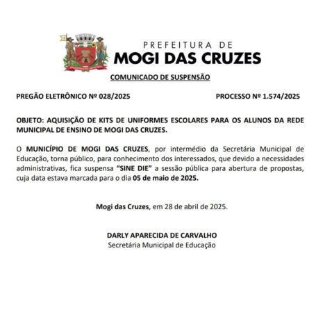 Segundo o documento, assinado pela secretária Darly Aparecida de Carvalho, devido a necessidades administrativas fica suspensa `”Sine Die`” (indefinidamente) a sessão pública para abertura das propostas, cuja data estava marcada para o dia 5 de maio.
