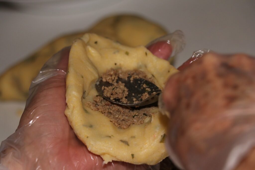 Feito com paixão – e uma boa conversa – na Casa da Festa, pelas incansáveis “abelhinhas” — como são carinhosamente chamadas as voluntárias que mantêm viva essa tradição —, o tortinho tem sua base na farinha de milho, misturada à farinha de mandioca branca e amarela. O recheio é um capítulo à parte: carne moída temperada com salsinha, cebolinha, coentro e louro, que confere aquele sabor caseiro e delicioso.