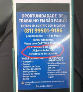 O cartaz de divulgação, que circulou em grupos de WhatsApp, indicava a saída de Pernambuco rumo a São Paulo no dia 28 de setembro e era assinado por um homem identificado como Ricardo. As funções oferecidas iam de manobrista e garçom a auxiliar de cozinha e serviços gerais, prometendo “alojamento incluso” e “refeições no restaurante”. No entanto, ao chegar a Mogi, os trabalhadores afirmam que encontraram uma realidade completamente diferente.