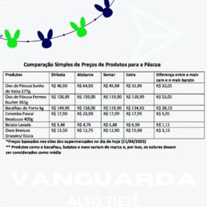 Uma breve pesquisa feita por meio dos sites de quatro supermercados que operam em Mogi das Cruzes aponta uma variação de preços de produtos para a Páscoa que chega a 97% de um local para o outro. A reportagem da Vanguarda Alto Tietê escolheu dois tipos de ovos de chocolate, bacalhau Porto, colomba pascal, batata lavada e ovos para comparar os preços nesses quatro comércios a fim de ajudar os consumidores na hora das compras.